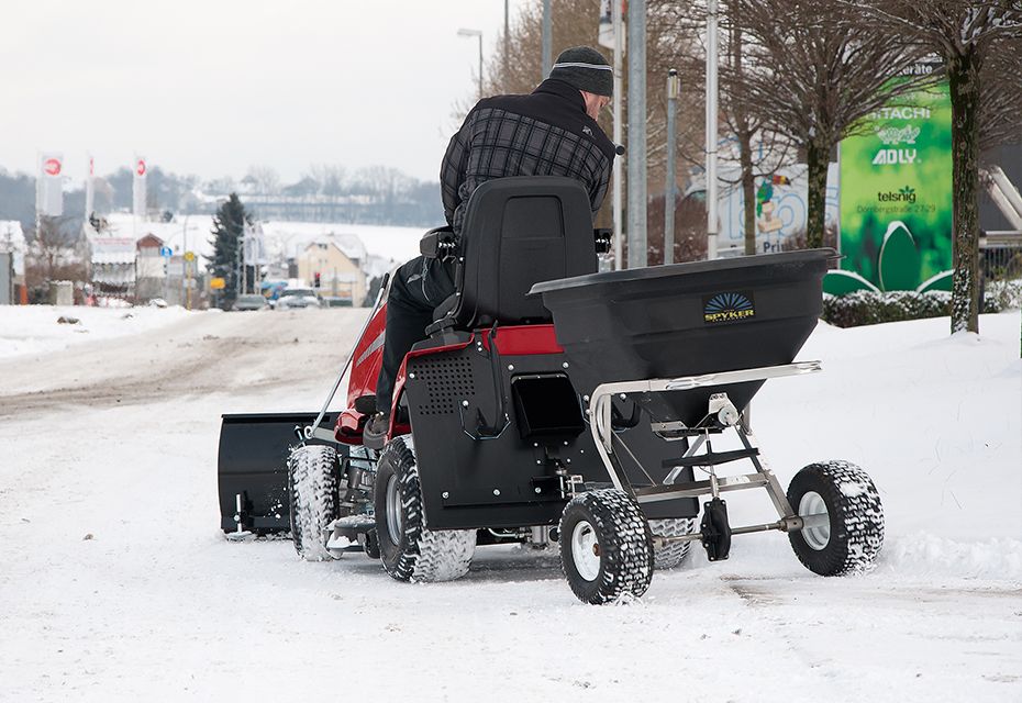 Mit widerstandsfähiger Konstruktion und ergonomischem Schiebegriff eignen sich die Modelle auch für den intensiven Einsatz. Durch verschiedene Behältergrößen und Streubreiten lässt sich für jede Fläche das passende Gerät finden. Der Streuanhänger bietet zudem die Möglichkeit, den Wagen an einen Rasentraktor mit Schneeschild zu hängen und so gleichzeitig den Schnee aus dem Weg zu räumen und zu streuen.